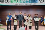 한국시사경제 권충언 기자 | 제14차 원주시강소농협의회 정기총회 및 이취임식이 지난 4일 원주시농업기술센터 생명농업관에서 개최됐다. 이날 원주시강소농협의회 제5대 회장으로 이학원 신임 회장이 취임했다. 또한 조경일 전임 회장을 비롯한 임원에게 시장 공로패가 수여됐으며, 우수회원 7명을 선발해 도지사 표창장 등을 전수했다. 이학원 신임 회장은 “작지만 강한 농업을 실현하고자 14년간 회원들이 피땀 흘려 일궈놓은 터전 위에 회장으로 취임하게 돼 감사드린다”라며, “앞으로도 원주시강소농협의회 회원들의 농가 소득 증대를 위해 최선을 다하겠다”라고 말했다.