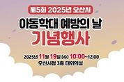 한국시사경제 권충현 기자 | 오산시는 오는 19일 ‘아동학대예방의 날’과 ‘아동학대예방주간’을 맞아 기념행사 및 온·오프라인 캠페인을 실시한다고 12일 밝혔다. 행사는 19일 오전 10시부터 12시까지 오산시청 대회의실에서 진행되며, ▲1부 아동학대예방의 날 기념식 식전공연, 유공자 표창 시상, 퍼포먼스, ▲2부 부모교육 특별강연으로 구성된다. 특별강연은 리플러스 인간연구소 박재연 소장이 ‘부모를 위한 건강한 대화방법’을 주제로 진행한다. 매년 11월 19일은 아동학대 예방과 방지에 대한 사회적 관심을 높이기 위해 제정된 법정기념일로, 오산시는 매년 기념식과 강연, 캠페인 등을 통해 아동학대 예방의 중요성을 알리는 다양한 활동을 추진해오고 있다. 시는 이달 25일까지 온라인 릴레이 캠페인도 함께 진행한다. 오산시민 누구나 SNS에 아동학대예방 메시지 또는 관련 사진을 업로드해 참여할 수 있다. 또한 11월 24일에는 시청 인근 주요 교차로에서 시민 대상 오프라인 홍보 캠페인을 실시해 아동학대 예방 인식 제고에 나설 예정이다. 박현주 아동복지과장은 “이번 행사가 아동학대 예방의 중요성을 되새기고 아이