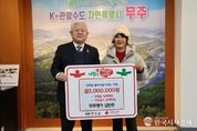 한국시사경제 김숙영 기자 | 무주군 무주읍에 위치한 한식 전문점 ‘무주명가’의 김민주 사장이 지난 14일 무주군에 이웃돕기 성금 1백만 원, (재)무주군교육발전장학재단에 장학금 1백만 원 등 총 2백만 원을 기탁했다. 김민주 사장은 “주민 여러분 덕분에 장사도 어느새 10년 세월을 넘겼다”라며 “앞으로도 지역과 이웃을 돌아보며 귀한 나눔을 실천할 수 있도록 열심히 살 것”이라고 밝혔다. 무주명가에서는 지난 2019년부터 6백만 원에 달하는 장학금을 기부한 바 있으며, 이외에도 불우이웃 돕기와 학생 교육에 힘쓰며 나눔문화 확산에 앞장서고 있다.
