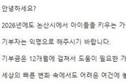 한국시사경제 김태훈 기자 | 논산의 새해를 매년 감동으로 물들인‘익명의 기부천사’가 올해도 어김없이 찾아왔다. 지난 2020년부터 6년째 논산시에 기부를 이어온‘익명의 기부천사’는 올해도 2억 7,300만원을 기탁했으며, 총 누적기부액은 14억 9,465만원에 달한다. 기부자는 이번 기탁금을 전달하며 “세상의 빠른 변화 속에서도 어려운 여건에 놓인 아이들이 자신의 가능성을 키워갈 수 있도록 보탬이 되고 싶다”는 진심 어린 마음을 전했다. 특히, ‘우리가 있기에 내가 있다’는 뜻의 아프리카어 ‘우분투(Ubuntu)’정신을 언급하며, 개인의 행복이 공동체의 행복으로 연결된다는 공생의 가치를 강조했다. 올해는 기부자의 뜻에 따라 지원 대상과 체계가 한층 확대됐다. 기존 18세 미만 자녀를 둔 차상위계층뿐 아니라, 교육급여 수급 가구까지 포함해 총 156가구가 혜택을 받는다. 지원기간도 기존 5개월에서 12개월로 늘어나, 취약계층 아동 가구가 1년 내내 조금 더 안정된 생활을 누릴 수 있게 됐다. 백성현 논산시장은 “매년 이어지는 고액 기부에 다시 한번 감사드린다”며
