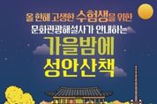 한국시사경제 김태훈 기자 | 청주시는 2026학년도 대학수학능력시험을 치른 수험생을 대상으로 ‘가을밤에 성안산책’ 프로그램에서 특별 이벤트를 진행한다고 12일 밝혔다. 11월 성안산책 프로그램에 참여한 수험생에게 성안길상점가에서 사용할 수 있는 상품권(5천원)을 제공하는 내용으로, 2026학년도 수능 수험표를 소지한 수험생에게 적용된다. 가을밤에 성안산책은 9~11월 매주 금요일과 토요일 오후 7시부터 8시까지 한 시간 동안 청주 원도심 문화유산 5곳을 돌며 청주시 문화관광해설사의 해설을 듣는 프로그램이다. 참가 신청은 청주여기 모바일 앱을 통해 가능하며, 사전 신청한 선착순 40명에 한해 상품권이 지급될 예정이다. 한편, 가을밤에 성안산책은 오후 7시 이후 유동 인구가 급감하는 성안길과 중앙공원 일대를 활성화하기 위해 기획됐다. 지난 10일 기준 누적 참여인원은 558명을 기록, 원도심을 대표하는 신규 야간관광 체험 콘텐츠로 자리매김하고 있다. 이현숙 관광과장은 “시험을 마친 수험생들이 가을밤 정취를 마음 편히 즐기고, 올 한해 지친 마음을 치유할 수 있는 알찬 시간이 되길 바란다”며