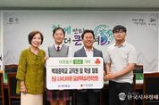 한국시사경제 김태훈 기자 | 백제중학교는 지난 7월 17일 학생들과 교직원이 함께 운영한 ‘일일 카페 및 플리 마켓’ 행사의 수익금 3백 642천 원을 어려운 이웃을 돕기 위한 성금으로 기탁했다. 이번 행사는 2022년 수익금 80여만 원의 기부를 시작으로 매년 이어져 온 학교의 전통으로, 2023년에는 호우피해 복구지원 200여만 원, 2024년에도 250여만 원을 기탁했다. 행사는 학생자치회와 교직원이 협력하여 기획하고 준비했으며 카페 운영과 판매 물품 준비 등 행사 전 과정에 학생과 교직원이 직접 참여하여 나눔의 의미를 더했다. 황현주 교장은 “학생들이 주도적으로 참여해 행사를 준비하고, 수익금을 기부하는 모습을 보며 큰 보람을 느꼈다.”라며 “이번 기부가 학생들에게 나눔을 실천하는 인재로 성장하는 좋은 기회가 되기를 바란다.”라고 말했다. 학생자치회장 이주연(3학년)은 “어려운 이웃들에게 조금이나마 도움이 되고자 하는 마음에 행사를 준비했다.”라며 “행사를 통해 나눔의 의미를 배우게 됐고 앞으로도 지역사회에 도움이 되는 활동에 참여하고 싶다.”라고 말했다. 이에 박정현 부여군수는