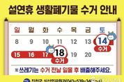 한국시사경제 오영주 기자 | 충북 진천군은 설 연휴 동안 관내 생활 쓰레기 수거 일정을 일부 조정하고 생활폐기물 관리 종합대책을 마련했다고 9일 밝혔다. 이번 조치는 군민들이 명절을 더욱 쾌적하게 보내고, 민원 문의 발생 시 신속하게 대응하기 위해 마련됐다. 명절 연휴 기간 중 14일은 오전에만 쓰레기를 수거하며, 연휴 마지막 날인 18일은 정상적으로 수거한다. 또한 군은 연휴 기간 발생할 수 있는 불편에 대비해 14일부터 18일까지 ‘생활 쓰레기 상황반’을 운영할 방침이다. 최지혜 군 환경과 주무관은 “각 가정에서는 반드시 수거일 전날 저녁에 생활 쓰레기를 배출해 주시기 바란다”며 “이번 명절 연휴 기간 군민들의 불편이 없도록 최선을 다하겠다”고 말했다.