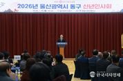 한국시사경제 울산취재본부 | 울산 동구는 1월 15일 오전 10시 30분 동구청 2층 대강당에서 2026년 울산광역시 동구 신년 인사회를 개최했다. 이번 신년 인사회는 동울산청년회의소(회장 전종현)가 주관한 것으로 김종훈 동구청장을 비롯한 동구 지역 각급 기관·단체장 200여 명이 참석하여, 구정 발전을 위한 덕담과 화합의 시간을 나눴다. 이날 행사에서는 ‘AI에게 동구의 미래를 묻다’라는 주제로 인공지능 프로그램을 활용해 동구청 직원들이 직접 제작한, ‘다시 뛰는 심장, 2040 울산 동구’ 영상을 함께 시청하며 동구의 미래를 그려보는 흥미로운 시간을 마련했다. 김종훈 구청장은 지난 3년 반의 시간 동안 ‘더 잘 사는 동구’를 목표로, 구청과 각급 기관단체가 함께 동구 주민의 더 나은 삶을 위해 힘써 왔다”라며 각급 기관·단체장들에게 감사의 인사를 전했다. 또한 “앞으로 산업과 도시의 구조 자체가 급변하는 미래를 맞이하여 한 단계 더 도약하고 성장하는 동구를 만들기 위해 기관·단체·기업이 손잡고 미래의 힘찬 여정을 함께해 주시길 바란다”라고 말했다.