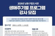 한국시사경제 윤광희 기자 | 인천시 남동구 구립도서관은 3~12월까지 운영하는 ‘2026년 상·하반기 생애주기별 프로그램’에 함께 할 프로그램 강사를 공개 모집한다고 12일 밝혔다. 올해 구립도서관 4개관(남동논현, 소래, 서창, 만수2동어린이도서관)의 생애주기별 프로그램은 10개 분야로 구성돼 운영될 예정이다. 강사 모집은 유아·아동 대상의 영어·한국사·생태·미술·전래놀이·경제 등 8개 강좌와 성인 대상의 책 놀이·영어독서 지도 교육 등 2개 강좌를 대상으로 한다. 관련 분야 전공자, 교육과정 이수자, 자격증 소지자, 강의 경력자라면 누구나 강사로 지원할 수 있다. 지원자는 강사지원서·강의계획서·자기소개서 등 서류를 준비해 1월 16일까지 남동논현도서관 또는 서창도서관에 방문하거나 이메일을 통해 제출하면 된다. 구는 매년 강사 공개 모집을 통해 여러 분야의 우수한 강사를 발굴·선발하여 생애주기별 프로그램을 진행하며, 지역주민의 교육적 삶의 질 향상과 독서문화 활성화를 통해 지역 내 독서문화 진흥을 도모할 수 있기를 기대하고 있다. 자세한 사항은 남동구립도서관 홈페이지 또는