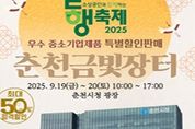한국시사경제 이정이 기자 | ‘2025 춘천금빛장터’가 오는 9월 19일부터 20일까지 이틀간 춘천시청 광장에서 열린다. 춘천금빛장터는 2025 동행축제와 연계한 지역 상생 소비 축제로, 강원지방중소벤처기업청을 비롯한 18개 유관기관이 힘을 모아 마련됐다. 이번 행사는 추석 명절을 앞두고 시민들에게 합리적인 소비 기회를 제공하고, 도내 중소기업 제품의 판로 확대를 지원하는 데 큰 의미가 있다. 이번 행사에는 강원도 내 우수 중소기업 67개사(관내기업 34개사)가 참여해 식품(커피, 참기름, 전통주 등), 생활용품(세정제, 디퓨저), 뷰티용품 등 100여 개 품목을 최대 50% 할인된 가격으로 선보인다. 또한 1+1 특별 기획전, 온라인 ‘춘천몰’ 연계 할인 판매 등 다양한 프로모션도 함께 진행된다 행사장에서는 할인 판매 외에도 시민들이 함께 즐길 수 있는 다채로운 부대행사가 준비돼 있다. ▲메이커스페이스 창작 체험 ▲어린이 장보기 체험 ▲노래자랑 등 온 가족이 함께 참여할 수 있는 프로그램이 운영된다. 더불어 3만원 이상 구매 고객 경품 증정도 마련돼 풍성한 즐거움을 선사할 예정이다. 육동한 춘천시