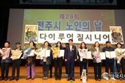 한국시사경제 전북취재본부 | 100세 시대를 맞아 전주지역 노인들의 행복하고 건강한 노후생활을 함께 염원하는 노인의날 기념식이 열렸다. 전주시와 대한노인회 전주시지회(지회장 홍성언)는 14일 전주학생교육문화관 공연장에서 우범기 전주시장과 최주만 전주시의회 부의장, 김두봉 대한노인회 전북특별자치도연합회장, 표창 수상자 등 1200여 명이 참석한 가운데 ‘제29회 전주시 노인의날 기념식’을 가졌다. 송민주 대한노인회 전주시지회 사무국장의 사회로 진행된 이날 기념식은 △무지개예술자원봉사단(단장 고대현)과 아름다운 실버 전주의꽃(단장 김인식)의 식전 공연 △노인 강령 낭독 △청려장(장수지팡이) 수여 △전주시장 및 전주시의장 표창 수여식 △노인복지공로자에 대한 공로장 수여식 등의 순으로 진행됐다. 특히 우범기 전주시장은 이날 기념식에서 올해 100세를 맞이한 김옥순 어르신(여, 덕진동)에게 무병장수의 상징인 청려지팡이를 전달했으며, 홍성언 지회장은 축하의 꽃다발을 선물했다. 홍성언 대한노인회 전주시지회장은 “풍성했던 한가위도 지나가고, 땀과 노력으로 이뤄낸 결실의 계절 가을을 맞이해 참석해 주신 우범기 전