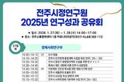 한국시사경제 전북취재본부 | 전주시정연구원(원장 박미자)은 개원 2주년을 맞아 27, 28일 양일간 전주시 주요 정책 연구성과를 공유하는 ‘2025년 연구성과 공유회’를 개최한다고 26일 밝혔다. 전주시 소통협력센터 1층 커뮤니티 라운지에서 열리는 연구성과 공유회는 전주시 정책 연구 결과를 시민, 관계기관, 전문가들과 공유하고 향후 정책 방향을 논의하기 위해 마련됐다. 첫째 날인 27일에는 경제사회연구부와 문화관광연구부의 연구성과 발표가 진행된다. 경제사회연구부에서는 ▲전주시 인구정책 종합계획 수립 연구(’26~’30) ▲전주시 중장기 종합발전계획 수립을 위한 연구 'Ⅰ' ▲특례시 제도 개편에 따른 전주시 대응방향, ▲지방재정 건전성 확보를 위한 방안 ▲전주시 세출관리 효율화 연구 ▲전주시 AI산업 육성 방향과 과제, ▲전주시 사회적경제 기본계획 수립 연구(‘26~’30)를 발표한다. 이어 문화관광연구부에서는 ▲전주 한옥마을 발전전략 기본구상, ▲전주한옥마을 일원 관광특구 지정을 위한 사전타당성 검토 연구, ▲전주시 정원산업 활성화 방안 연구, ▲전주시 생활 인구 확대 방안 연구, ▲로케이션 인센티브 개선 방안, ▲전주시