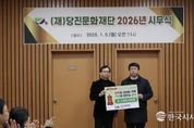 한국시사경제 충남취재본부 | (재)당진문화재단이 2026년 새해 업무의 시작을 지역사회를 위한 따뜻한 나눔으로 알렸다. 재단은 5일 오전 개최된 2026년 시무식에서 ‘희망 2026 나눔 캠페인’ 성금 전달식을 가졌다고 밝혔다. 이번 행사는 새해를 맞이해 지역사회와의 상생 의지를 다지고, 문화예술 기관으로서 공공의 사회적 책임을 다하기 위해 마련됐다. 이날 전달된 성금 200만 원은 재단 임직원들이 십시일반 정성을 모아 자발적으로 마련한 기금으로 구성됐다. 재단 구성원 전체가 한마음으로 뜻을 모아 새해 첫 공식 행사를 기부로 시작하며 나눔 문화 확산에 앞장섰다는 점에서 의미가 깊다. 재단은 이번 성금을 충남사회복지공동모금회 ‘희망 2026 나눔 캠페인’ 계좌로 기탁했으며, 전달된 성금은 지역사회 내 따뜻한 손길이 필요한 곳곳에 임직원들의 소중한 뜻과 함께 전달될 예정이다. 당진문화재단 이원철 대표이사는 “시무식을 통해 임직원이 함께 나눔의 가치를 되새기며 새해를 시작하게 되어 뜻깊다”며, “예술이 시민의 삶에 활력을 주듯, 재단 임직원들의 작은 정성이 이웃들에게는 희망의 불씨가 되길 바란다”고 전했