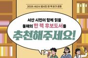 한국시사경제 충남취재본부 | 충남 서산시는 오는 1월 6일부터 2월 14일까지 2026년 범시민 한 책 읽기 운동의 후보 도서를 추천받는다고 밝혔다. 범시민 한 책 읽기 운동은 매년 대표 도서를 선정하고, 다양한 독서 행사를 통해 지역 독서 운동을 촉진하는 사업이다. 시는 일반 부문과 아동 부문에 각 1권을 대표 도서로 선정할 계획이다. 추천 도서는 장르와 형식에 상관없이 국내 작가의 작품 중 각종 독서 문화 행사로 활용할 수 있는 도서다. 시립도서관, 시립도서관 대산분관, 공립 작은 도서관에 방문해 추천서를 작성하거나 서산시립도서관 누리집 및 홍보물에 있는 큐아르코드(QR코드)를 활용해 추천하면 된다. 시 관계자는 “한 책 읽기 사업을 통해 책으로 하나 되는 서산시를 만들 수 있도록 올해의 대표도서 선정에 많은 관심과 참여를 바란다”라고 말했다.
