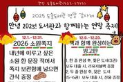 한국시사경제 충남취재본부 | 천안시 도솔도서관은 12월 한 달간 ‘도솔도서관 연말 감사제’를 운영한다고 3일 밝혔다. 도솔도서관은 시민들에게 감사한 마음을 전하기 위해 ‘안녕 2025! 도서관과 함께하는 연말 축제’를 열고 다채로운 문화 프로그램을 선보인다. 프로그램은 ▲새해로 보내는 메시지-2026 소원 쪽지 ▲도솔, 언제 태어났게? 개관 연도 퀴즈 ▲책과 함께 완성하는 빙고판 ▲달성하라! 2단계 종이접기 미션 ▲크리스마스 선물 원화 전시로, 시민 누구나 자유롭게 참여할 수 있다. 도서관 관계자는 “연말 감사제를 통해 시민들이 도서관에서 따뜻한 시간을 보내길 바란다”며 “누구나 부담없이 참여할 수 있는 프로그램인 만큼 많은 참여 바란다”고 말했다.