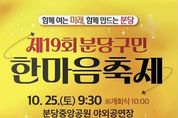 한국시사경제 경기취재본부 | ‘제19회 분당구민 한마음 축제’가 오는 10월 25일 오전 9시 30분~오후 1시 중앙공원 야외공연장에서 열린다. 성남시 분당구가 후원하고 분당구민 한마음 축제 추진위원회(위원장 김성민)가 주최해 열리는 이번 행사는 지역사회 화합 분위기를 조성하고자 ‘함께 여는 미래, 함께 만드는 분당’을 주제로 진행된다. 이날 성남시립합창단과 시민 예술단 아인스바움의 공연으로 축제의 화려한 막을 연다. 이어 수내3동, 정자3동, 야탑1동, 백현동 주민자치센터 문화 프로그램에 참여 중인 4개 팀이 난타, 한국무용, 줌바, 에어로빅 등 흥겨운 공연으로 중앙무대를 꾸민다. 초청 가수 김용필(미스터트롯2 출신)의 ‘오히려 좋아’, ‘낭만의 계절’, 바이올리니스트 백진주와 소프라노 유경진이 듀엣으로 연주하는 영화음악(OST) ‘캐리비안의 해적’, ‘대부’, 성남청년프로예술단의 댄스 공연도 열려 축제 분위기를 달군다. 중앙공원 황새울광장에는 배틀 로봇, 4족 보행 로봇 등 6개의 4차산업 체험존, 시민 체험용 드론 축구존, 추억의 사진관을 차려 운영한다. 장애인 복합사업장인 굿윌스