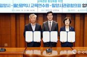 한국시사경제 울산취재본부 | 울산교육연수원은 21일 밀양시청 소회의실에서 경남 밀양시, 밀양시관광협의회와 지역 자원을 활용한 현장 체험 연수 지원 등을 내용으로 하는 업무협약을 체결했다. 이번 협약은 밀양시가 보유한 교육 관광 자원을 적극 활용해 교직원의 연수 참여 기회를 확대하고 교직원의 역량을 높이고자 추진됐다. 이번 협약으로 밀양시는 주요 교육 관광 자원의 정보를 제공하고 관광협의회는 프로그램을 연계 지원한다. 울산교육연수원은 이번 협약에 따라 오는 11월 밀양시 단장면에 있는 선샤인 밀양 테마파크에서 지방공무원과 교육공무직원을 대상으로 현장 체험형 연수를 진행할 예정이다. 한현숙 원장은 “이번 협약은 교육, 문화, 관광을 통합한 연수 프로그램 운영의 토대를 마련했다는 점에서 큰 의미가 있다”라며 “앞으로도 지역 자원을 교육 제작물로 적극 활용해 연수생에게 현장 중심의 체험 기회를 제공하겠다”라고 말했다.