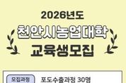 한국시사경제 충남취재본부 | 천안시농업기술센터는 내달 6일까지 ‘2026년도 천안시농업대학’ 교육생 30명을 모집한다고 23일 밝혔다. 천안시농업대학은 시의 농업을 선도할 신지식 농업인 양성을 목표로 운영되고 있으며, 현재까지 18기 35개 과정을 통해 1,139명의 졸업생을 배출했다. 올해는 포도 수출 확대와 경쟁력 강화를 위해 ‘포도수출 과정’을 개설·운영할 예정이다. 모집 대상은 천안시에 주소를 둔 농업인 또는 농업 종사 예정자로, 입학원서는 센터에 방문하거나 전자우편을 통해 제출하면 된다. 자세한 사항은 센터 교육운영팀으로 문의하면 된다.