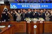 한국시사경제 노승선 기자 | 경남 밀양시는 15일 시청 소회의실에서 밀양시 발전에 기여한 전·현직 부시장 3명에게 명예시민증을 수여했다. 밀양시 명예시민증은 우방국가 또는 다른 지방자치단체의 주민으로서 밀양시정에 공로가 현저하거나 밀양시를 방문하는 귀빈에게 수여하는 증서로, 밀양시 부시장을 역임한 27대, 28대, 29대 부시장에게 수여됐다. 수여 대상자는 △27대 밀양시 부시장 김성규(현 경상남도 교육청년국장) △28대 밀양시 부시장 허동식(현 부산진해경제자유구역청 개발본부장) △29대 밀양시 부시장 곽근석(현 밀양시 부시장)이다. 수여 대상자들은 재임 기간 동안 시정의 주요 현안을 해결하며 밀양시의 다양한 정책을 이끌어 지역의 경제적, 사회적 발전에 기여해 왔다. 특히, 나노융합국가산업단지 조성 및 기업유치 기반 강화, 창녕~밀양 간 고속도로 개통, 김해~밀양 고속도로 건설 추진 등 지역경제 활력을 위한 기반 마련에 공통적으로 힘써왔다. 아울러 스마트 선도 농업을 통한 활기찬 밀양 조성, 머물고 싶고 다시 찾는 밀양을 만들기 위한 다양한 정책을 추진하며 품격 있는 문화·관광 도시 조
