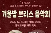 한국시사경제 윤광희 기자 | 김포시 통진도서관은 오는 12월 23일 저녁 7시부터 8시까지 다가오는 연말을 기념하여 온 가족이 함께 즐길 수 있는 브라스 음악공연을 운영한다. 이번 공연은 경기아트센터에서 지원하는 ‘찾아가는 문화복지공연’ 사업으로, 김포시 북부권 시민들을 대상으로 일상 가까이에서 문화예술을 만나는 기회를 제공하고, 지역 간 문화 격차를 완화하고자 기획했다. 이번 공연은 금관 5중주로 구성된 앙상블 코리안아츠의 풍성한 선율로 채워질 예정이며, 코리안아츠는 대한민국 국제관악제 홍보대사와 2018년 평창동계올림픽 개막식 《승리의 팡파레》를 연주하는 등 화려한 이력을 지닌 팀으로, 클래식은 물론 영화와 대중음악 등 다양한 장르를 넘나들며 새로운 음악적 시도를 이어가고 있다. 도서관 관계자는 “이번 공연은 영화 및 애니메이션 음악공연으로 누구나 쉽게 즐길 수 있으며, 이번 공연을 통해 온 가족이 따듯한 연말을 보내길 바란다”라고 말했다.