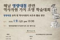 한국시사경제 권충현 기자 | 해남군은 오는 9일 해남 우수영 명량대첩해전사기념전시관에서‘해남 명량대첩 관련 역사자원 가치 조명’를 주제로 학술대회를 갖는다. 이번 학술대회는 명량대첩의 역사적 의미를 재조명하고, 관련 유적의 국가유산적 가치를 종합적으로 검토, 향후 체계적인 보존 및 활용 방안을 모색하기 위해 마련됐다. 이날 학술대회에서는 ▲전라우수영의 설치와 방어 체제의 변화(신윤호, 해군사관학교 해양연구소위원) ▲임진왜란 시기 전라우수사와 해남 지역민의 활약(이수경, 지역유산연구원장) ▲13척으로 일군 신화, 명량대첩의 의미와 위상(제장명, 전 순천향대이순신연구소장) ▲명량대첩 유적 국가유산 가치 검토(성대철, (재)전남문화유산연구원) 등의 주제 발표가 이어질 예정이다. 주제 발표 후에는 김희태 전라남도 문화유산위원을 좌장으로 김만호 전남연구원 책임연구위원, 송은일 전남대학교 이순신해양문화연구소실장, 김경옥 목포대학교 교수, 안용섭 전라남도 문화유산위원 등 전문가들이 참여하는 종합 토론이 이어져 명량대첩의 역사적 의미를 되새기고 지역 발전의 초석을 다질 예정이다. 군 관계자는 "이번 학술대회가 명