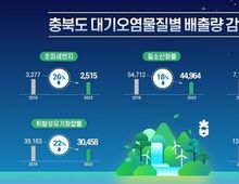 한국시사경제 사회팀 | 충북도는 ’23년 대기오염물질 배출량이 `19년 대비 큰 폭으로 감소했다고 밝혔다. 2025년 12월 국가미세먼지정보센터 누리집(air.go.kr)에서 공개된 '2023년 충북 대기오염물질 배출량 산정결과'에 따르면, 2023년 초미세먼지(PM-2.5) 연간 배출량은 2019년 3,377톤보다 862톤(26%) 감소한 2,515톤이다. 아울러, 황산화물(SOx)은 272톤(4%), 질소산화물(NOx)은 9,747톤(18%), 휘발성유기화합물(VOCs)은 8,725톤(22%) 각각 감소했으나, 암모니아(NH3)는 490톤(4%) 소폭 증가했다. 대기오염물질의 주요 삭감 배출원을 살펴보면 △초미세먼지(PM-2.5)는 농업잔재물소각 580톤(43%) △황산화물(SOx)은 비산업연소(주거용시설) 299톤(45%) △질소산화물(NOx)은 도로이동오염원(화물차, RV) 5,302톤(51%) △휘발성유기화합물(VOCs)은 농업잔재물소각 6,063톤(64%)에서 배출량이 크게 감소했다. 반면 암모니아(NH3)는 비료사용(농경지) 163톤(59%)에서 감소했으나, 농업분야(가축분
