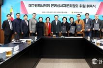 한국시사경제 오영주 기자 | 대구광역시의회는 1월 23일 오전 11시, 시의회 2층 회의실에서 ‘대구광역시의회 윤리심사자문위원회’ 위원 위촉식을 개최했다. 위촉식에는 이만규 의장을 비롯해 윤리특별위원회 위원들이 참석했으며, 이어 열린 첫 회의에서 변호사윤지원법률사무소 윤지원 변호사를 위원장으로 선출하고 자문위원회 운영 방향에 대해 논의했다. 윤리심사자문위원회는 학계, 법조계, 언론계, 시민사회단체 등 각 분야의 민간 전문가 7명으로 새로이 구성됐으며, 향후 의회의 투명성과 책임성 강화를 위해 활동할 예정이다. 이만규 의장은 “외부 전문가의 고견을 의정 활동에 적극 반영해 시민에게 신뢰받는 의회를 만들어 가겠다”며, “이번 위촉을 통해 대구시의회 청렴도가 한층 제고되는 계기가 될 것으로 기대한다”고 말했다. 한편, 윤리심사자문위원회는 ‘지방자치법’에 근거해 ▲의원의 겸직 및 영리행위에 관한 의장 자문, ▲의원의 윤리강령과 윤리실천규범 준수 여부 및 징계에 관한 윤리특별위원회 자문 등의 역할을 수행하며, 위원 임기는 2년으로 1회에 한하여 연임할 수 있다.