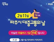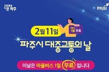 한국시사경제 경기북부취재본부 | 파주시는 ‘대중교통의 날’을 맞아 대중교통 이용 활성화와 시민 교통비 부담 완화를 위해 오는 2월 11일 하루 동안 파주시 전 지역의 모든 마을버스를 무료로 운행한다. 이번 마을버스 무료 운행은 시민들의 자가용 이용을 줄이고 대중교통 이용을 촉진함으로써, 교통 혼잡 완화와 탄소 배출 저감 등 친환경 교통 문화 확산을 도모하기 위해 지난해에 이어 두 번째로 시행되는 행사다. 무료 이용 대상은 파주시민뿐만 아니라 파주시를 운행하는 마을버스 노선을 이용하는 모든 승객이다. 이용 방법은 간단하다. 승차 시 현금이나 교통카드 단말기를 찍지 않고 별도의 절차 없이 탑승하면 이용 요금이 전액 면제되며, 하차 시에도 카드 단말기를 찍지 않아야 한다. 단, 다회 환승에 따라 환승 시간이 필요한 경우에는 교통카드를 찍고 이용할 수 있다. 박한수 버스정책과장은 “대중교통의 날을 맞아 시행하는 마을버스 무료 이용이 시민들에게 대중교통을 보다 친숙하게 이용하는 계기가 되길 바란다”라며, “앞으로도 시민들의 교통 편의를 높이고 보다 효율적인 대중교통 서비스를 제공하기 위해 지속적으로 노력하겠