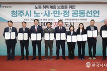 한국시사경제 경제팀 | 청주시 노사민정협의회는 16일 임시청사 대회의실에서 2025년 제2차 청주시 노사민정협의회를 열고, 청주시 노동정책의 첫 중장기 종합계획인 ‘청주시 노동존중정책 기본계획(2026~2030)’에 대한 심의를 진행했다. 회의는 이범석 청주시장 주재로 홍성수 한국노총 충북본부 청주지역지부 의장, 이태희 충북경영자총협회 회장을 비롯해 노동계, 경영계, 시민사회, 지방정부를 대표하는 노(勞)·사(使)·민(民)·정(政) 위원 9명이 참석한 가운데 열렸다. 이날 심의된 청주시 노동존중정책 기본계획은 그동안 개별적·단편적으로 추진돼 온 노동 관련 정책을 종합·체계화한 청주시 최초의 중장기 계획으로, 향후 5년간 청주시 노동정책의 비전과 추진 방향을 담고 있다. 아울러 2026년 노사민정협력 활성화 사업 추진계획에 대한 심의를 통해, 기본계획의 정책 방향을 현장 중심의 협력사업으로 구체화하는 방안도 함께 논의했다. 특히 플랫폼·특수고용·파견 노동자 등 노동 취약계층의 권익 보호와 안전한 노동환경 조성을 위해 노사민정이 공동의 책임 아래 협력해 나갈 것을 다짐하는 ‘노동 취약계층 보호를 위한
