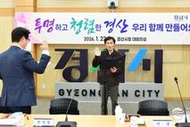 한국시사경제 권충언 기자 | 경산시는 23일 경산시청 대회의실에서 2026년 간부 공무원 반부패·청렴실천 결의대회를 개최했다. 이번 결의대회는 간부 공무원의 청렴 의지 내재화와 반부패 실천 의지 확산을 목표로, 시장을 비롯한 국·소·과장급 간부 공무원들이 참석한 가운데 조직문화 개선의 선도자로서 청렴 실천 솔선수범에 대한 각오와 결의를 다짐하는 자리로 마련됐다. 행사는 ▲반부패·청렴 실천 결의문 낭독 및 선서 ▲서명식 ▲청렴 구호 제창 순으로 진행되었으며, 형식적인 선언을 넘어 실질적인 행동 변화로 이어지는 청렴 문화 조성에 중점을 두었다. 특히 이날 결의대회에서 경산시 전 공직자를 대표하여 조현일 시장이 청렴 실천 결의문을 직접 낭독하고 서약서에 서명하며 ‘청렴으로 신뢰받는 경산’을 만들겠다고 다짐했다. 경산시는 그동안 ▲청렴 교육 강화 ▲청렴 해피콜 실시 ▲부패행위 익명신고센터 설치 ▲힐링 노무사 운영 등 다양한 반부패 정책을 추진해 왔으며, 이번 결의대회를 계기로 시민이 체감하는 청렴 행정을 더욱 공고히 해 나갈 계획이라고 밝혔다. 조현일 시장은 “청렴은 행정의 신뢰를 결정짓는 가