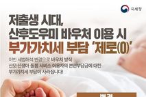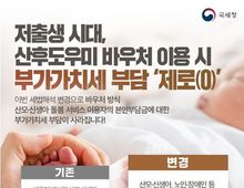한국시사경제 문화팀 | ■ 저출생 시대, 산후도우미 바우처 이용 시 부가가치세 부담 '제로(0)' 이번 세법해석 변경으로 바우처 방식 산모·신생아 돌봄 서비스 이용자의 본인부담금에 대한 부가가치세 부담이 사라집니다! (기존) 바우처 방식의 산모·신생아 돌봄 서비스 이용 시 본인부담금에 대한 부가세 부과 (변경) 산모·신생아, 노인·장애인 등 바우처 방식 사회복지 서비스 이용자들의 본인부담금 부가세 면세 앞으로도 국세청은 세법 집행과정에서 불합리한 측면이 있는지 세심히 살피고, 저출생 관련 세금 부담을 줄이는 등 '합리적이고 따뜻한 세정' 구현을 위해 최선의 노력을 다하겠습니다!