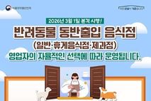 한국시사경제 문화팀 | [영업자용] 2026년 3월 1일 본격 시행! 반려동물 동반출입 음식점(일반·휴게음식점·제과점) ■ 영업자의 자율적인 선택에 따라 운영됩니다. (방문 전) · 출입구 '반려동물 동반 가능' 안내문을 확인해 주세요. · 예방접종 완료 반려동물(개, 고양이 한정)만 동반 가능해요. (식사 때) · 매장 안에서 전용의자·케이지·목줄을 사용해주세요. · 조리 공간은 출입이 제한돼요. · 다른 손님을 배려해 충분한 거리를 유지해 주세요. (위생은 기본 매너) · 반려동물 식기구분, 음식은 덮개 사용을 꼭 해주세요. · 배변물은 전용 용기에 처리해 주세요. [소비자용] 반려동물 동반출입 음식점 ■ 반려인도 준비사항이 있어요! ① 예방접종은 기본 반려동물 동반출입 음식점 출입 시 예방접종 증명서 또는 사진 등 증빙자료를 보여주세요! ② '반려동물 동반출입 음식점' 안내문 확인 '반려동물 동반출입 음식점' 안내문을 확인 후 이용하세요! ③ 반려동물 동반출입 음식점에 있는 동안 반려동물은 이동하면 안돼요! 반려동물 간 또는 사람