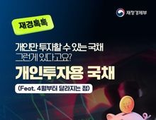 한국시사경제 문화팀 | 개인만 투자할 수 있는 국채 그런게 있다고요? 개인투자용 국채(Feat. 4월부터 달라지는 점) ■ 개인투자용 국채? 개인만 살 수 있는 원리금 보장 상품이에요. 최소 10만 원부터 청약할 수 있고, 만기까지 들고 있으면 표면금리 + 가산금리 + 복리 이자까지 지급합니다! ■ 어떻게 투자하나요? 판매대행기관(미래에셋증권)을 통해 간단하게 청약 신청이 가능합니다. - 1인당 최소 10만 원부터 - 연간 최대 2억 원까지 다만, 중도환매(해지)는 1년이 지난 후에 가능하고, 가산금리를 더한 복리 이자와 이자소득 분리과세 혜택은 받을 수 없어요. ■ 4월부터 이렇게 달라집니다! · 발행 규모 2100억 원으로 확대! · 3년물 신규 발행(이표채 + 복리채) · 청약 기간: 4월 9일(목) ~ 4월 15일(수)