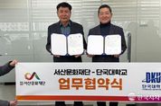 한국시사경제 충남취재본부 | 서산문화재단은 지난 12월 단국대학교 정책경영대학원과 상호 협력체계 구축과 교류 확대를 통한 공동 발전을 도모하고자 교류협력 협약(MOU)을 체결했다고 밝혔다. 서산문화재단과 단국대학교 정책경영대학원은 이번 협약을 통해 지역 인재 양성과 인프라 교류를 중심으로 문화·정책 분야에서 지속적인 협력 관계를 구축해 나가기로 뜻을 모았다. 협약에 따라 양 기관은 인재 양성을 위한 상호 협력과 관련 분야 발전을 위한 사항들을 적극 추진할 예정이다. 특히 단국대학교 정책경영대학원의 학위과정 및 모집요강 등은 향후 서산문화재단을 통해 함께 홍보될 예정으로, 지역 문화행정과 정책 분야의 전문 인재 발굴에도 긍정적인 효과가 나타날 것으로 기대된다. 아울러 이번 협약에는 서산문화재단 임직원을 대상으로 한 특별장학금 지원 내용이 포함돼, 조직 구성원의 역량 강화와 자기 계발을 적극적으로 뒷받침할 계획이다. 이에 따라 재단 소속 3명이 2026학년도 단국대학교 정책경영대학원 문화예술콘텐츠학과에 합격해 진학을 앞두고 있다. 서산문화재단 임진번 대표이사는 “이번 협약은 재