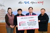 한국시사경제 권충언 기자 | 대한곡물협회 김천시지부(지부장 윤진채)에서는 26일 김천시청을 방문해 ‘희망2026 나눔캠페인’ 성금 300만 원을 기부했다. 윤진채 지부장은 "회원들의 뜻을 모아 이웃사랑과 나눔을 실천하는 ‘희망2026 나눔캠페인’에 기부할 수 있어 매우 뜻깊게 생각한다. 앞으로도 지역사회 발전에 기여할 수 있도록 노력하겠다.”라고 전했다. 배낙호 김천시장은 “윤진채 지부장님과 회원님의 따뜻한 나눔 활동에 감사드린다. 지역사회의 연대와 나눔이 김천시가 지속적인 발전을 이어가는 원동력이 된다.”라고 말했다. 대한곡물협회는 양곡을 도정하는 사업자와 양곡을 보관하는 사업자들을 대표하는 비영리 사단법인으로, 김천시지부는 10명의 회원으로 운영되고 있다.