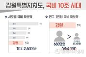 한국시사경제 경제팀 | 강원특별자치도는 국비 확보 10조 시대에 진입한 가운데, 인구 1인당 국비 확보액이 약 680만 원으로 전국 1위에 해당한다고 밝혔다. 2026년도 강원특별자치도 국비 확보액은 총 10조 2,600억 원으로 경기, 경북, 충남, 경남에 이어 전국 시도 중 5위에 해당한다. - 이는 도보다 인구가 2배 이상 많은 인천(6조 4,000억 원)과 부산(10조 2,000억 원)보다 많은 수치이다. 특히 국비 총액을 인구수로 환산한 인구 1인당 국비 확보액은 약 680만 원으로 전국 평균 413만 원을 크게 웃도는 수치다. 도는 이번 국비 확보 성과가 정부 차원에서 도가 추진 중인 주요 사업의 필요성과 중요성에 대한 공감한 결과로 보고 있다. 도는 앞으로 국비가 단순한 규모에 그치지 않도록 사업 추진의 완성도와 체감 성과를 높이는 데 행정력을 집중할 계획이다. 김진태 지사는 “국비 10조 원이 체감되기 어려울 수 있지만 총 규모로는 전국 기준 5위, 도민 1인당으로 환산하면 약 680만 원으로 전국 1위에 해당한다”며, “확보된 국비가 현장에서 차질없이 집행돼