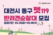 한국시사경제 대전취재본부 | 대전 동구(구청장 박희조)는 주민과 반려견이 함께 지역 안전을 지키는 ‘동구 펫(PET)119 반려견순찰대’ 사업을 본격 추진하며, 참여 신규 대원을 모집한다고 13일 밝혔다. ‘반려견순찰대’는 반려견과의 일상적인 산책 활동에 순찰 기능을 접목한 주민 참여형 범죄예방 프로그램으로, 산책 중 범죄 의심 상황이나 화재·응급 등 위험 요소를 발견하면 112·119 등에 신고하는 역할을 담당한다. 모집 기간은 이달 13일부터 다음 달 18일까지이며, 신청은 홍보물 내 정보무늬(QR코드) 또는 반려견순찰대 공식 누리집을 통해 가능하다. 선발 심사는 다음 달 21일 오전 10시 동구 반려동물놀이터(우송대)에서 진행되며, ▲보호자의 통제력 ▲반려견의 사회성 등을 종합적으로 평가해 약 50팀을 최종 선발할 계획이다. 선발된 순찰대는 다음 달 28일 용수골 어린이공원에서 발대식을 갖고, 오는 12월까지 관내 주요 지역에서 순찰 활동을 펼칠 예정이다. 특히, 활동 대원에게는 임명장 수여와 순찰 용품이 지급되며, 자원봉사 실적 인정과 우수 활동팀 표창 등 다양한 혜택도 함께 제