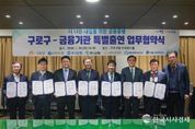 한국시사경제 기동취재팀 | 구로구가 1월 29일 구청 3층 르네상스홀에서 신한은행, 우리은행, 하나은행, 국민은행, 새마을금고, 서울신용보증재단과 ‘더 나은 내일을 위한 금융동행’ 특별출연 협약을 체결하고, 총 212억 5천만 원 규모의 중소기업·소상공인 특례보증을 추진한다. 이번 협약은 자금 조달에 어려움을 겪는 지역 내 기업들의 금융 접근성을 높이기 위한 것으로, 구로구와 5개 금융기관이 공동으로 출연한 재원을 바탕으로 서울신용보증재단이 보증을 지원하는 방식이다. 협약에 따라 총 22억 원의 출연금이 조성됐다. 출연 비율은 구로구 2억 원, 신한은행 8억 원, 우리은행 4억 원, 하나은행·국민은행 각 3억 원, 새마을금고 2억 원이다. 서울신용보증재단은 이를 기반으로 보증한도 212억 5천만 원의 특례보증을 시행한다. 특히 신한은행 출연금 가운데 5억 원은 담보력이 부족한 중소기업과 소상공인을 위한 특별보증 재원으로 별도 활용될 예정이다. 융자 한도는 중소기업 최대 1억 원, 소상공인 최대 5천만 원이며, 구로구에 사업장을 두고 사업자등록이 되어있는 경우 신청할 수 있다. 대출 조건은 1년 거치