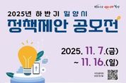 한국시사경제 노승선 기자 | 경남 밀양시는 시민의 창의적인 아이디어를 시정에 반영하기 위해 오는 7일부터 16일까지 ‘2025년 하반기 정책제안 공모전’을 실시한다고 밝혔다. 이번 공모전은 △인구, 청년 △지역경제, 일자리, 산업 △문화, 관광 △보건, 복지 △주거, 안전, 환경 △농업, 기타 등 6개 분야로 나눠 진행되며, 밀양 시정에 관심 있는 국민 누구나 참여할 수 있다. 시는 이번 공모를 통해 시민과의 소통을 강화하고, 정책 수립 과정에 시민 참여를 확대해 실제 시정에 반영할 수 있는 창의적이고 현실적인 아이디어를 적극 발굴할 계획이다. 참여 방법은 국민권익위가 운영하는 국민생각함 또는 시 정책공모 담당자 이메일로 제출하면 되며, 우편 및 방문 접수(밀양시 밀양대로 2047, 밀양시청 5층 인구정책담당관실)도 가능하다. 접수된 제안은 △실시 가능성 △창의성 △효율성 △적용 범위 △계속성 등을 기준으로 담당 부서의 1차 내부 심사, 외부 전문가가 참여하는 2차 우수제안심사위원회 심사를 거쳐 최대 17건의 우수 제안이 선정된다. 선정된 제안에는 금상 1명(100만원), 은상 2명(각