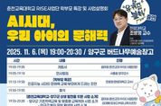 한국시사경제 권충언 기자 | 양구군은 춘천교육대학교 및 강원대학교와 협력해 2025년부터 2029년까지(5년간) 강원특별자치도 RISE(지역혁신중심 대학지원체계)사업을 추진하기로 했다. 연간 약 13억 원의 사업비를 확보한 양구군은 2개 대학(춘천교대, 강원대)과 양구 맞춤형 교육 케어 및 백자 문화산업 스케일업과 평생교육 생태계 구축 등으로, 교육‧문화‧산업이 융합된 지역혁신 생태계를 실현할 계획이다. 그 첫 번째 단계로, 양구군은 춘천교육대학교 RISE사업단과 오는 6일 오후 7시에 버드나무 예술창고 공연장에서 학부모 등 150여 명을 대상으로 학부모 특강 및 사업설명회를 개최한다. 이번 행사는 인공지능 시대에 요구되는 핵심 역량 중 하나인 문해력 교육의 방향성을 공유하고, 춘천교대와 양구군의 교육·문화 분야 상생 발전 사례를 안내하기 위해 마련됐다. 1부에서는 국내 문해력 연구 권위자인 한양대학교 조병영 교수의 ‘인공지능 시대의 문해력 교육: 부모에게 드리는 조언’이란 주제로 급격한 기술 변화 속에서 학생들의 학습 이해도 및 정보 활용 능력을 높이는 방법과, 가정에서 실천할 수 있는 문해력 향상 전략 학부