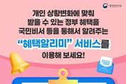 한국시사경제 문화팀 | 개인 상황변화에 맞춰 받을 수 있는 정부 혜택을 국민비서 등을 통해서 알려주는 "혜택알리미" 서비스를 이용해 보세요! · 알림 대상 혜택 행정·공공기관이 제공하는 모든 공공서비스(6,000여종) · 이용 대상 국민 누구나(*만 14세 미만 제외) · 이용 방법 ① 정부24 접속 ② 혜택알리미 가입·이용 *다음 페이지 참고 ■ 혜택알리미 이용 동의 방법 ① 정부24 웹페이지 또는 정부24 어플을 통해 접속해 주세요. ■ 혜택알리미 이용 동의 방법 ② 모바일에선 정부24 하단에 "혜택알림"을 통해 바로 접속 가능해요. ■ 혜택알리미 이용 동의 방법 ③ 동의 후 맞춤 혜택 알림 받기를 클릭해주세요. 본인인증 이후 이용동의를 진행해 주세요. ■ 혜택알리미 이용 동의 방법 ④ 정부24 회원가입 시 혜택알리미 서비스 이용동의를 선택해 주세요. - 혜택알리미 이용약관에 동의하면, 맞춤혜택 알림 등 다양한 서비스를 제공받을 수 있어요! ■ 혜택알리미 이용 동의 방법 ⑤ 회원가입을 위한 회원 정보를 입력하고 간편인증을 진행해 주세요. - 본인